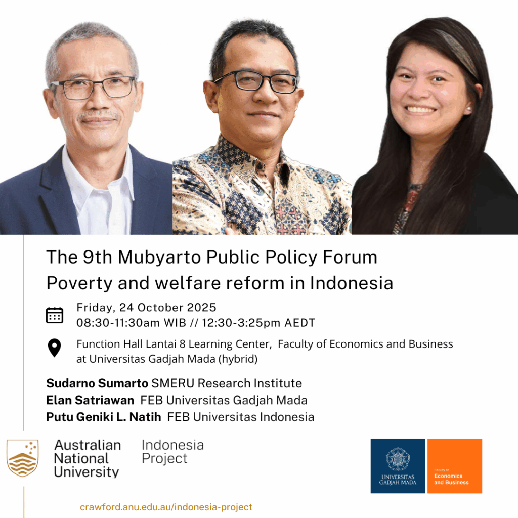 This annual public policy forum series is named in honour of Professor Mubyarto, a prominent economist at the Universitas Gadjah Mada, who was probably one of Indonesia’s most influential intellectuals on the issue of rural development between the 1960s and 1990s. The goal of the forum is to stimulate a debate on key development policy issues in Indonesia. The main target groups are key policy makers in government agencies, international institutions (including donor agencies), and internationally oriented business leaders, as well as senior academics, economic researchers, and graduate students. This annual major academic and policy forum is organized by the ANU Indonesia Project, in collaboration with the Faculty of Economics and Business at Universitas Gadjah Mada.
