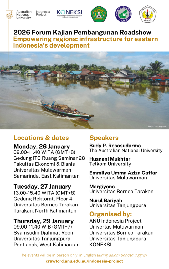 The 2026 FKP Roadshow will explore the role of infrastructure in supporting economic development in eastern Indonesia, with a focus on experiences in Kalimantan. The Roadshow will be conducted at Universitas Mulawarman (Monday, 26 January), Universitas Borneo Tarakan (Tuesday, 27 January), and Universitas Tanjungpura (Thursday, 29 January) and will feature presentations by academics from the host university, Telkom University and The Australian National University (ANU). The research presented will address infrastructure challenges, regional disparities, and policy implications for strengthening connectivity and growth outside Java. Each seminar concludes with an open discussion to encourage critical exchange and comparative insights across regions.