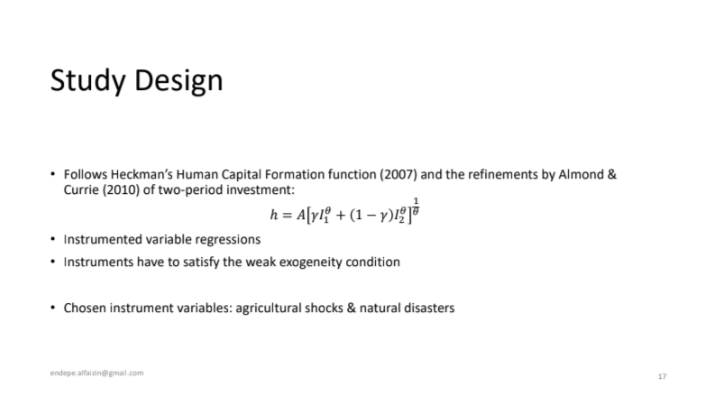 Following Heckman’s Human Capital Formation function and the fine-tuning by Almond & Curie, Ruli made use of agricultural shocks & natural disasters within the first 60 months of life as instruments to assess whether they lead to stunting. Through this study, Ruli found that the exposure to early-life shocks lead to 0.3 SD lower HAZ in children. Consequently, this condition is linked to 1 fewer year of education and lower adult income.