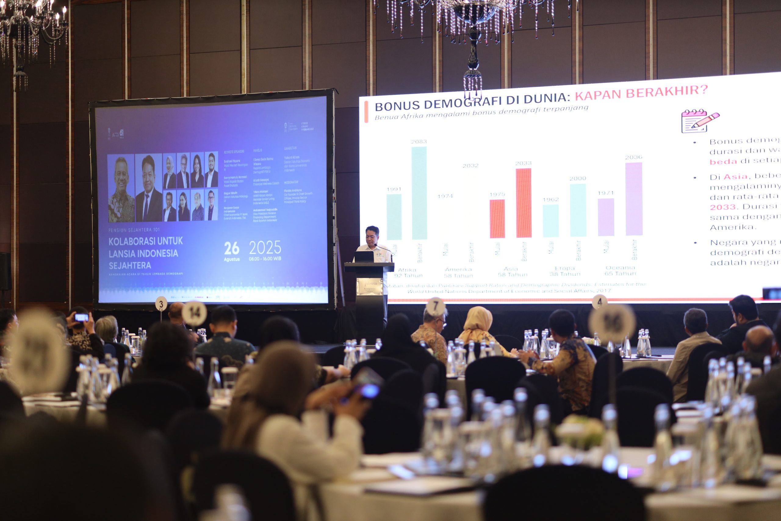 Dalam sesi keynote pertama, Sonny Harry B. Harmadi, Wakil Kepala Badan Pusat Statistik RI dan mantan Kepala LD, menekankan bahwa tantangan penuaan penduduk tidak hanya terletak pada peningkatan jumlah lansia, tetapi pada sistem data dan kebijakan untuk meresponsnya. Masih terdapat ketimpangan kesejahteraan dan akses antar wilayah dimana sebagian besar lansia tinggal di pedesaan, memiliki tingkat pendidikan rendah, serta masih bergantung pada dukungan keluarga karena minimnya perlindungan pensiun. Di saat yang sama, lebih dari 70% belum terhubung dengan layanan digital, sehingga berisiko tertinggal dari transformasi sistem jaminan sosial, kesehatan, dan keuangan berbasis teknologi. Tanpa integrasi big data, sinkronisasi registrasi kependudukan, dan pembacaan longitudinal terhadap mobilitas ekonomi lansia, kebijakan hanya akan menangani permukaan persoalan. Dalam konteks transisi demografi, keberhasilan Indonesia tidak diukur dari seberapa lama penduduk hidup, tetapi seberapa layak dan terlindungi mereka menjalani usia tua.