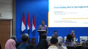 In his keynote lecture, Dr. Sudarno Sumarto honored the legacy of Prof. Mubyarto, reminding that genuine development goes beyond economic growth it must uphold human dignity, social justice, and community empowerment. Reflecting on two decades of reform, he argued that Indonesia’s social protection must now evolve from a mere “safety net” into a “springboard” a system that not only prevents poverty but also enables upward mobility and inclusive prosperity. Although Indonesia’s poverty rate has dropped significantly, Sumarto warned that vulnerability remains widespread: nearly half the population lives below twice the poverty line, and 60 percent of workers remain in informal employment. These structural weaknesses could undermine Visi Indonesia Emas 2045. Social protection, he asserted, should no longer be treated as a fiscal burden but as a strategic investment in human capital.